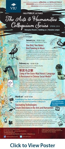 Faculty and student presenters will include Maria Bassett, Rick Conroy, Laura Cranmer, Robin Davies, Dr Patrick Dunae, Deanna MacGillivray, Dr Richard Lane, Kathleen Reed, Darcie Smith, and Dr Dawn Thompson and will represent the Arts and Humanities Departments of First Nations, Media Studies, History, English, and Graphic Design as well as the Library.
