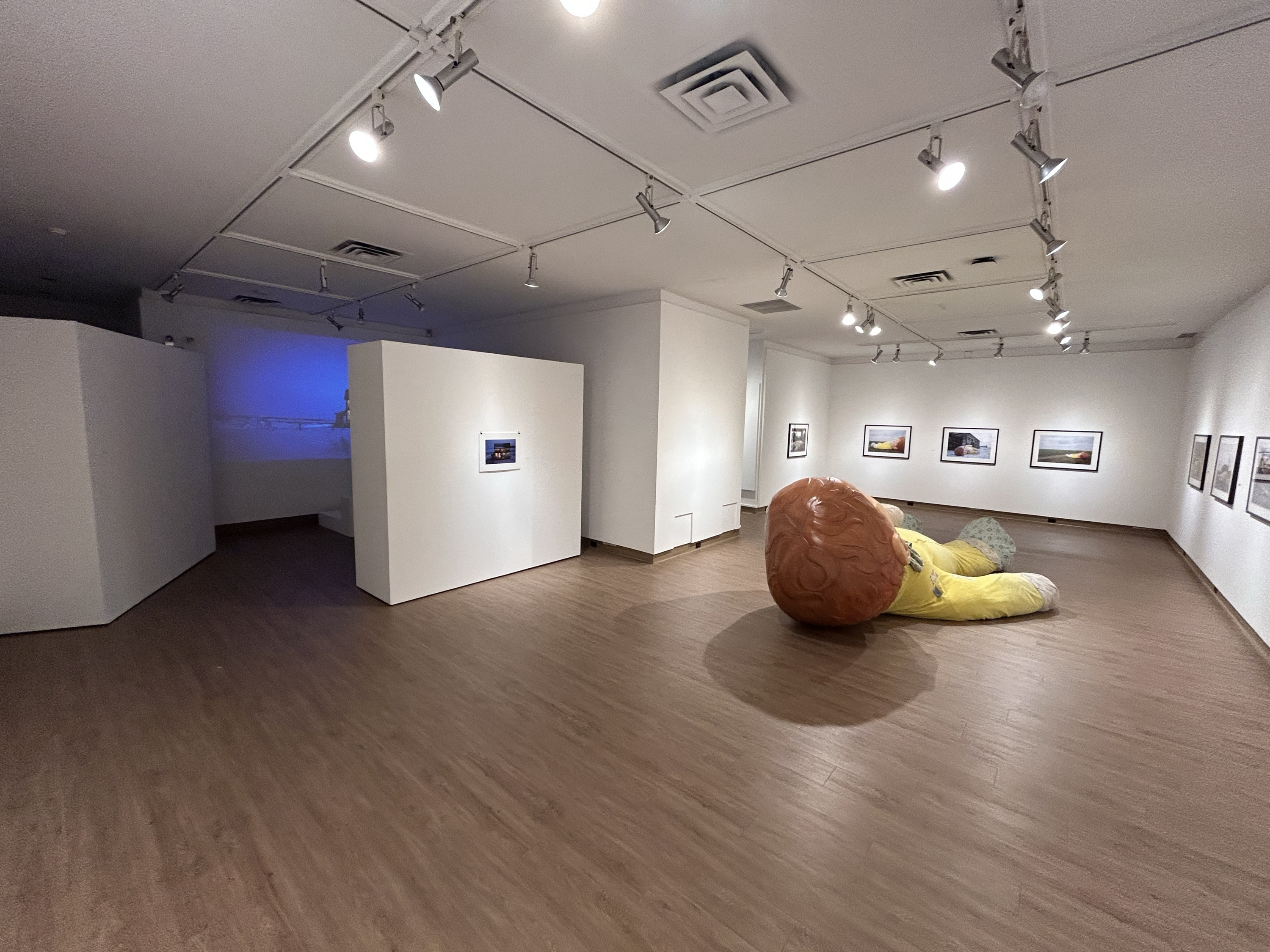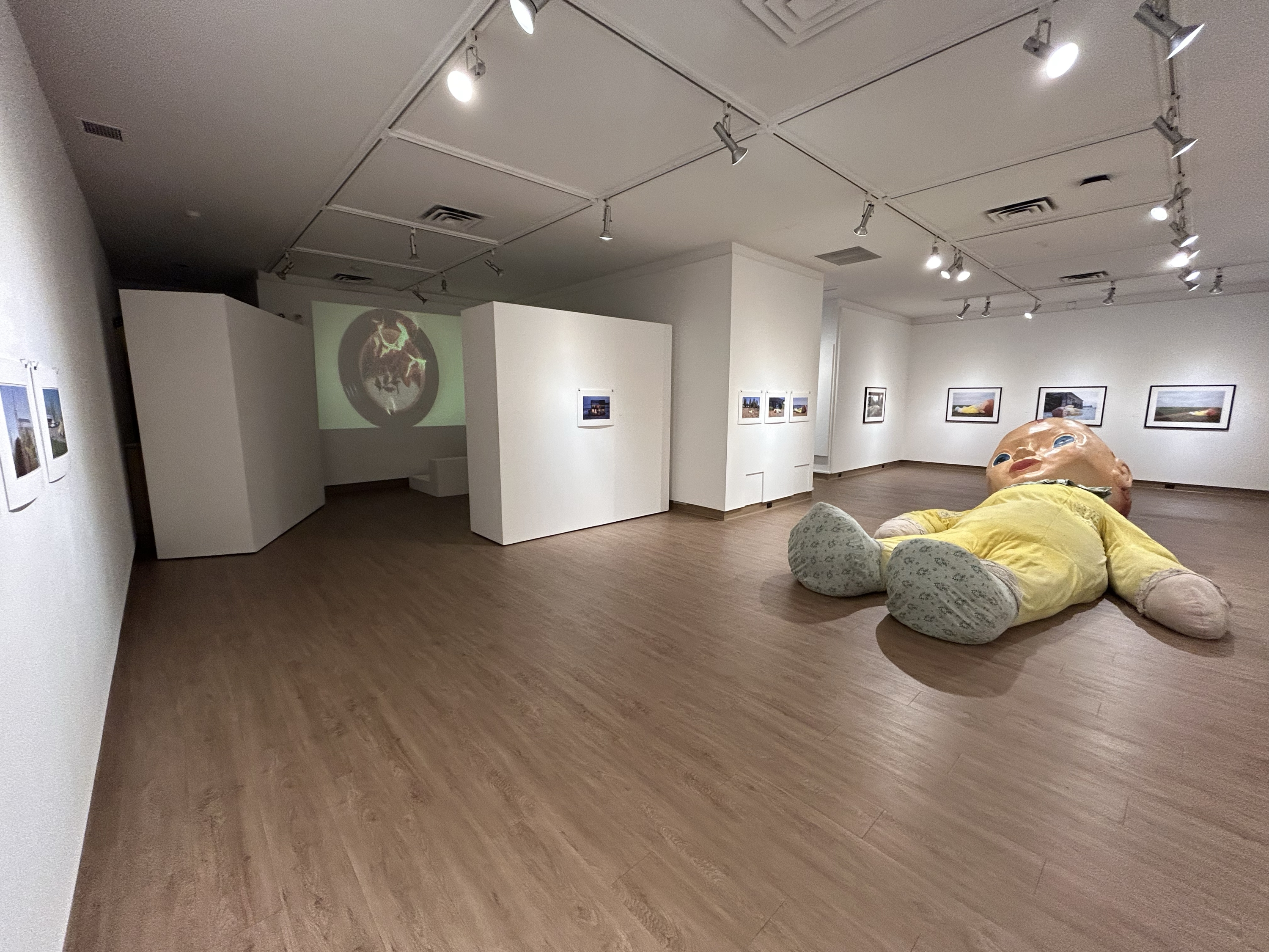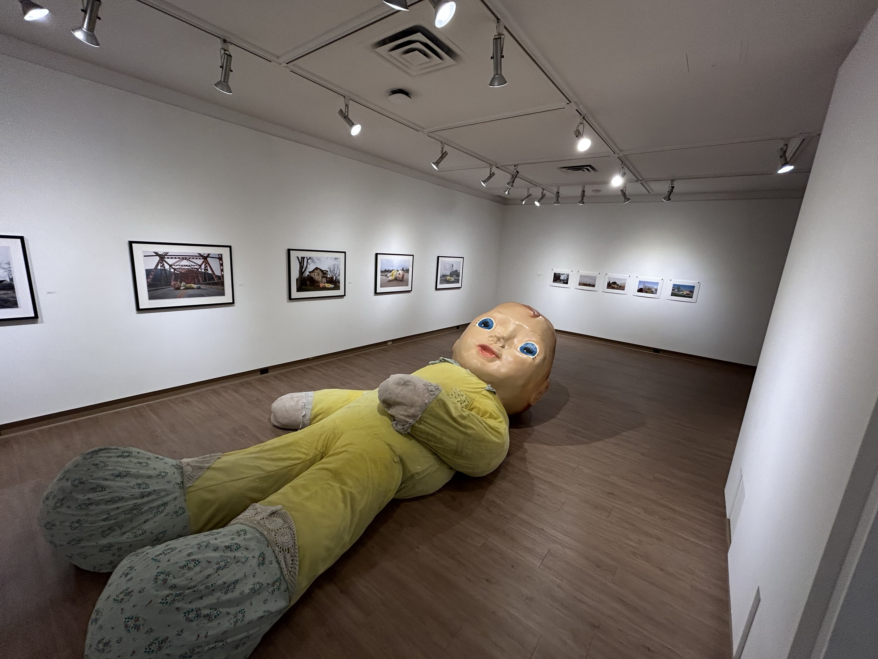 Saskatchewan artist Heather Benning’s exhibition Field-Doll-House is mediation on place in an age of increasing mobility. It brings together elements from two of the artist’s projects over the last two decades. Field Doll features a 16 ft long sculpture of a doll modelled after Benning’s own childhood doll that accompanied the her on many of her own journeys. The sculpture is displayed along with a series of photographs that document the Field Doll’s journey over the last decade of being exhibited in multiple cities across the continent.