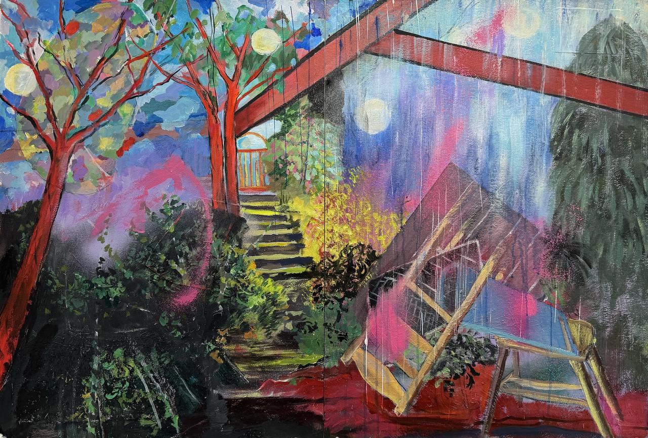 It’s this slippage of what is, was, could be, that Shwart presents to her audience; still, we recognize the chair as a chair, a sidewalk or path as a conveyance, a fence as an impediment, and the various shorelines as invitations to lay alongside –daydreaming– on warm afternoons. Shwart began this body of work during the dark days of the pandemic, using old snapshots she’d taken decades earlier with the intention to incorporate these images into paintings before the tasks of day-to-day waking life took precedence, only to reemerge just in time for the world to hold still. Amidst her palette of warm fuchsia and cool cobalt, of sketchy pastel shading, bold acrylic lines, and glossy spray paint, it’s what we don’t see –what is denied, or withheld– that allows us to claim this daydream nation as our own for a moment. Don’t get lost in the once used playground equipment, the discarded oil drums, the ghost of scaffolding; these aren’t our memories.