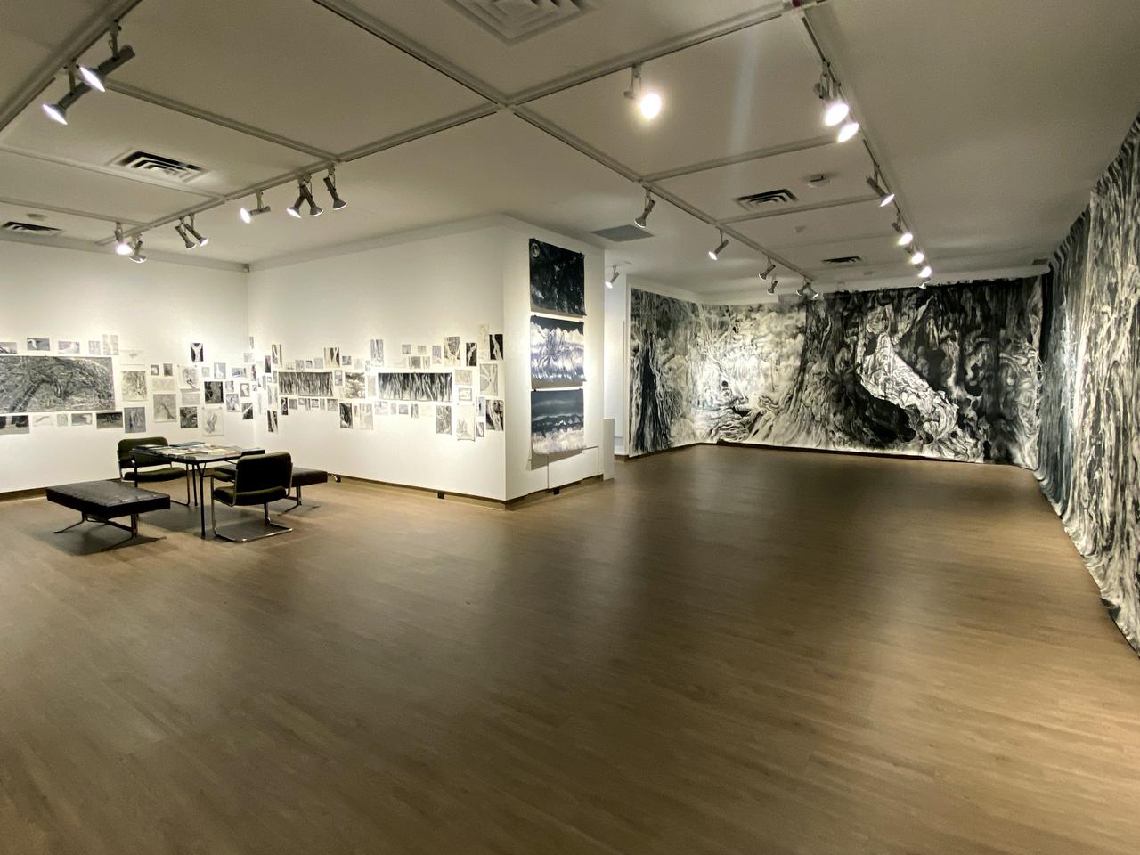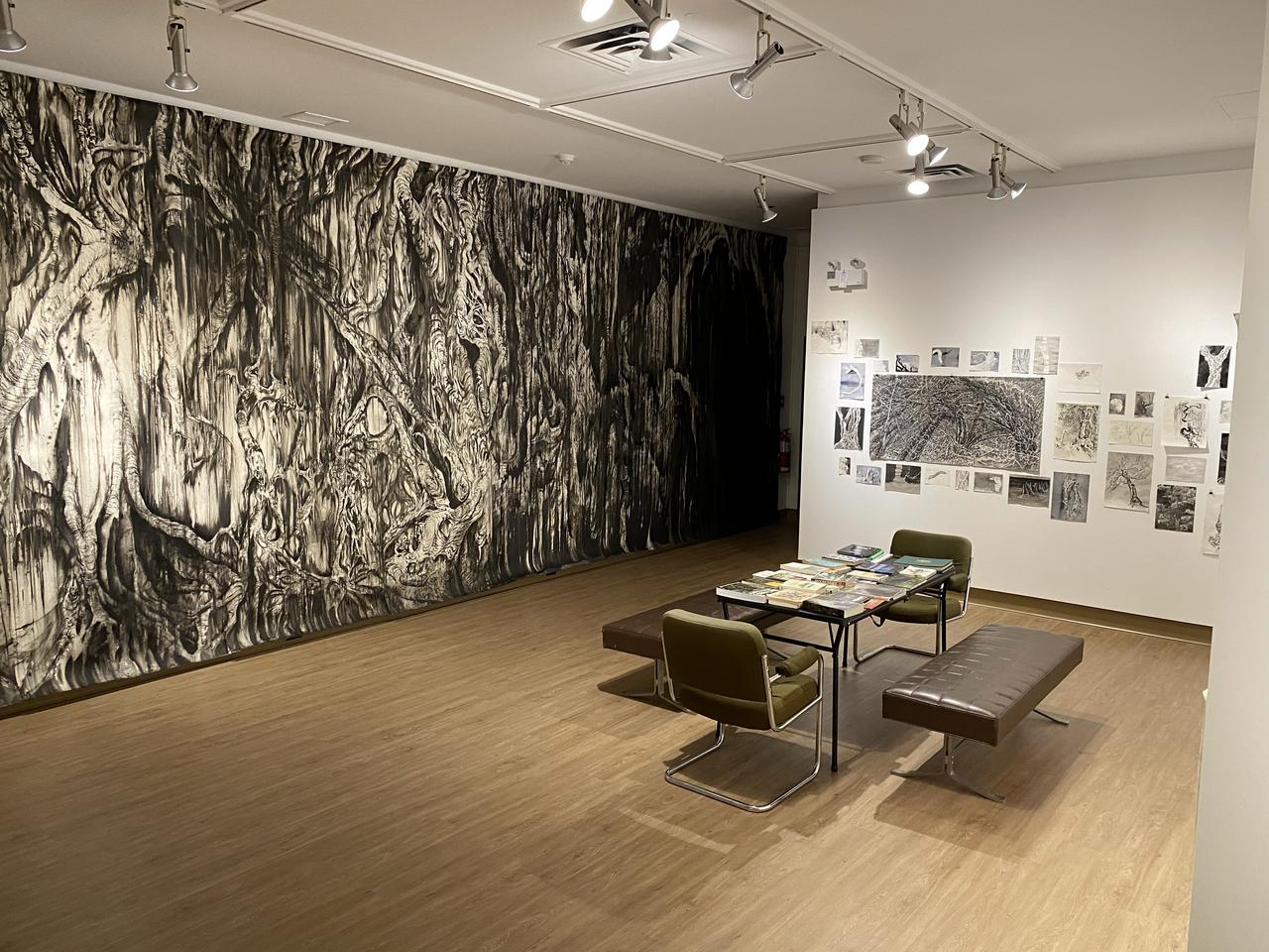 Jim Holyoak is first and foremost a drawer. His tool kit includes brushes and pens of all shapes and sizes, whisk brooms - large and small, straws and bubble making gear. Chinese and India ink are his preferred media, and the forest and its inhabitants (real and imagined), are his preferred subjects. Drawing inspiration equally from faerie tales and folk lore, alongside research from the most current forest science of biologists like Suzanne Simard and E. O. Wilson, Holyoak casts a mesmerizing spell in this all-immersive drawing installation. The undulating limbs and trunks of trees seem to reach out from the wall. They invite us - they beckon us into the fecundity of their rich biodiverse universe.