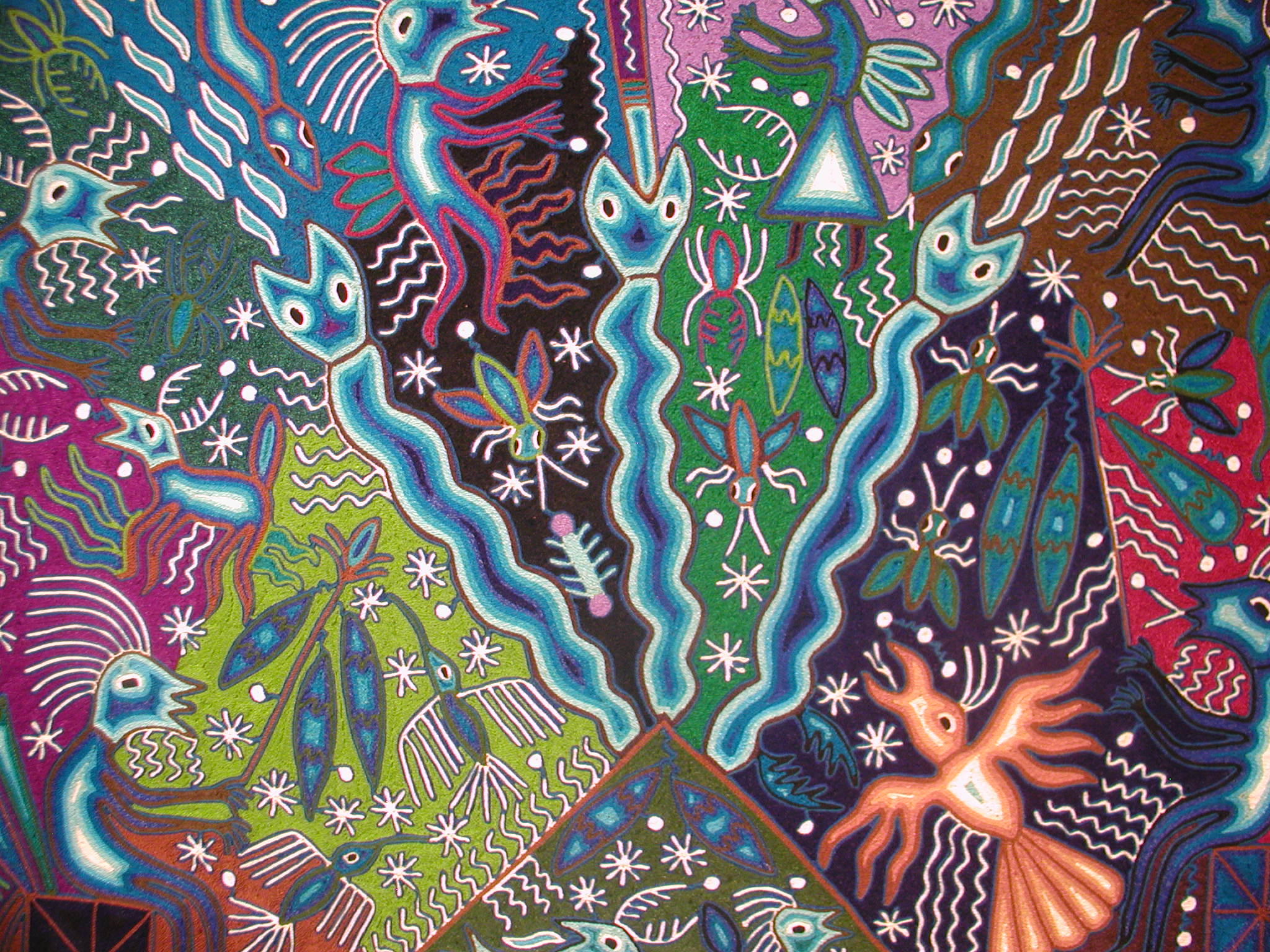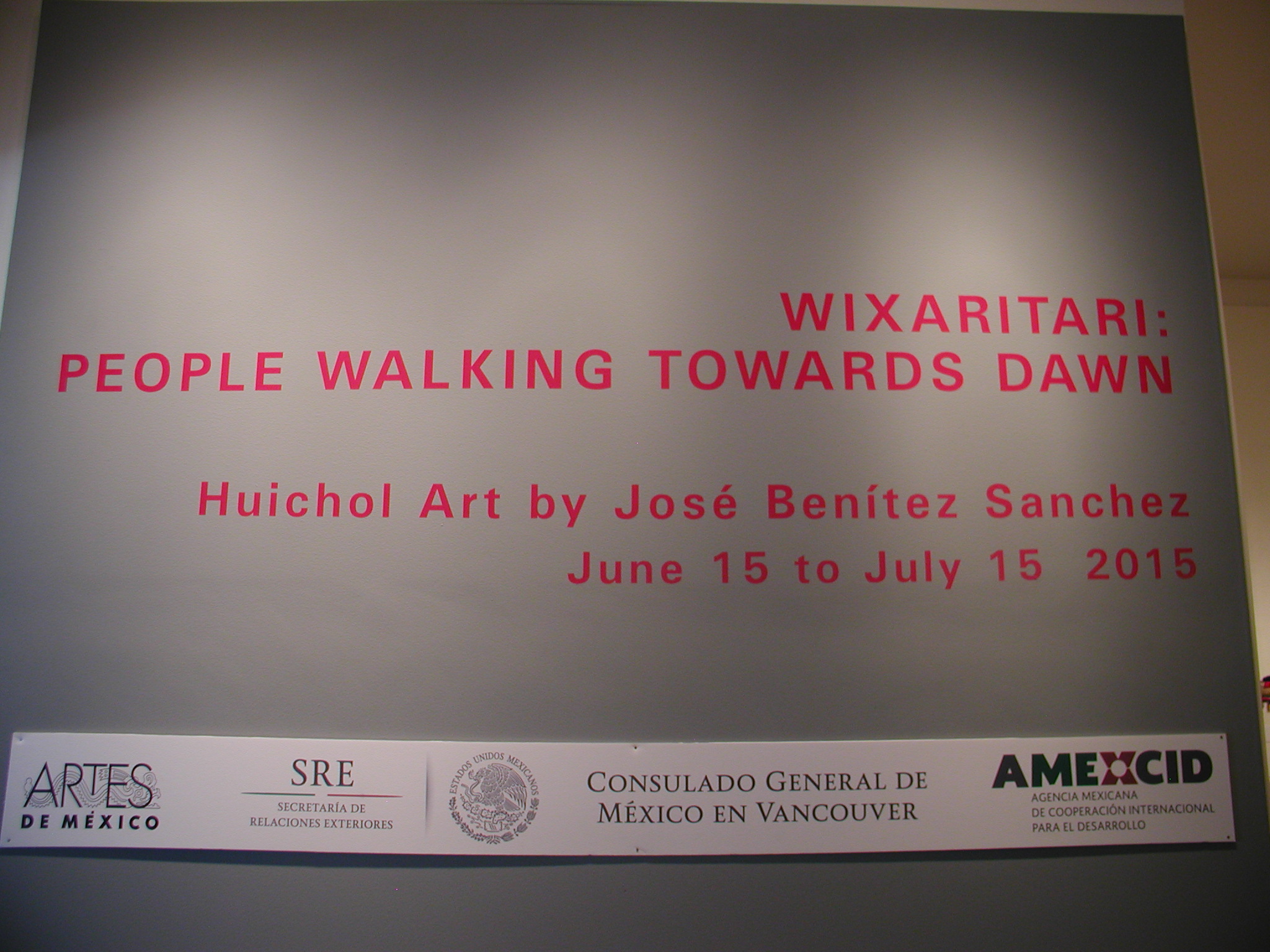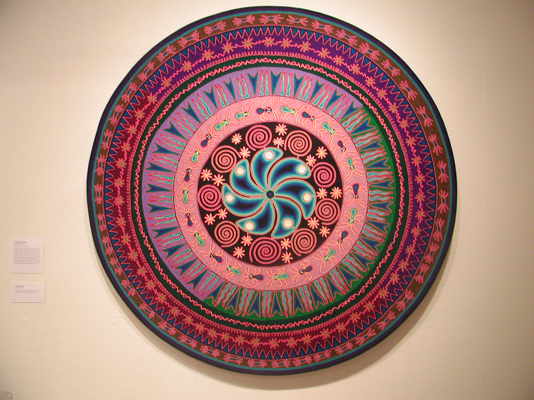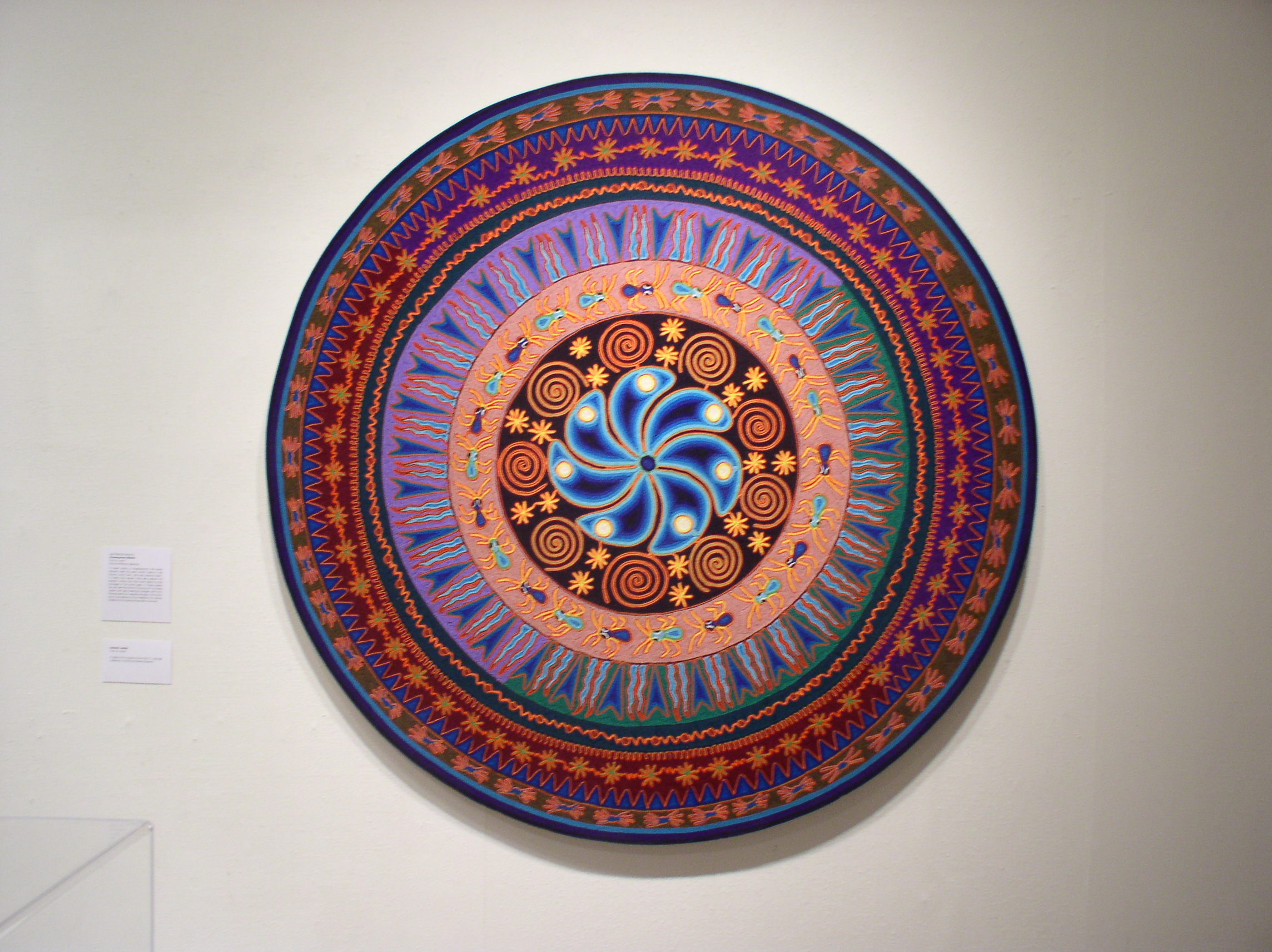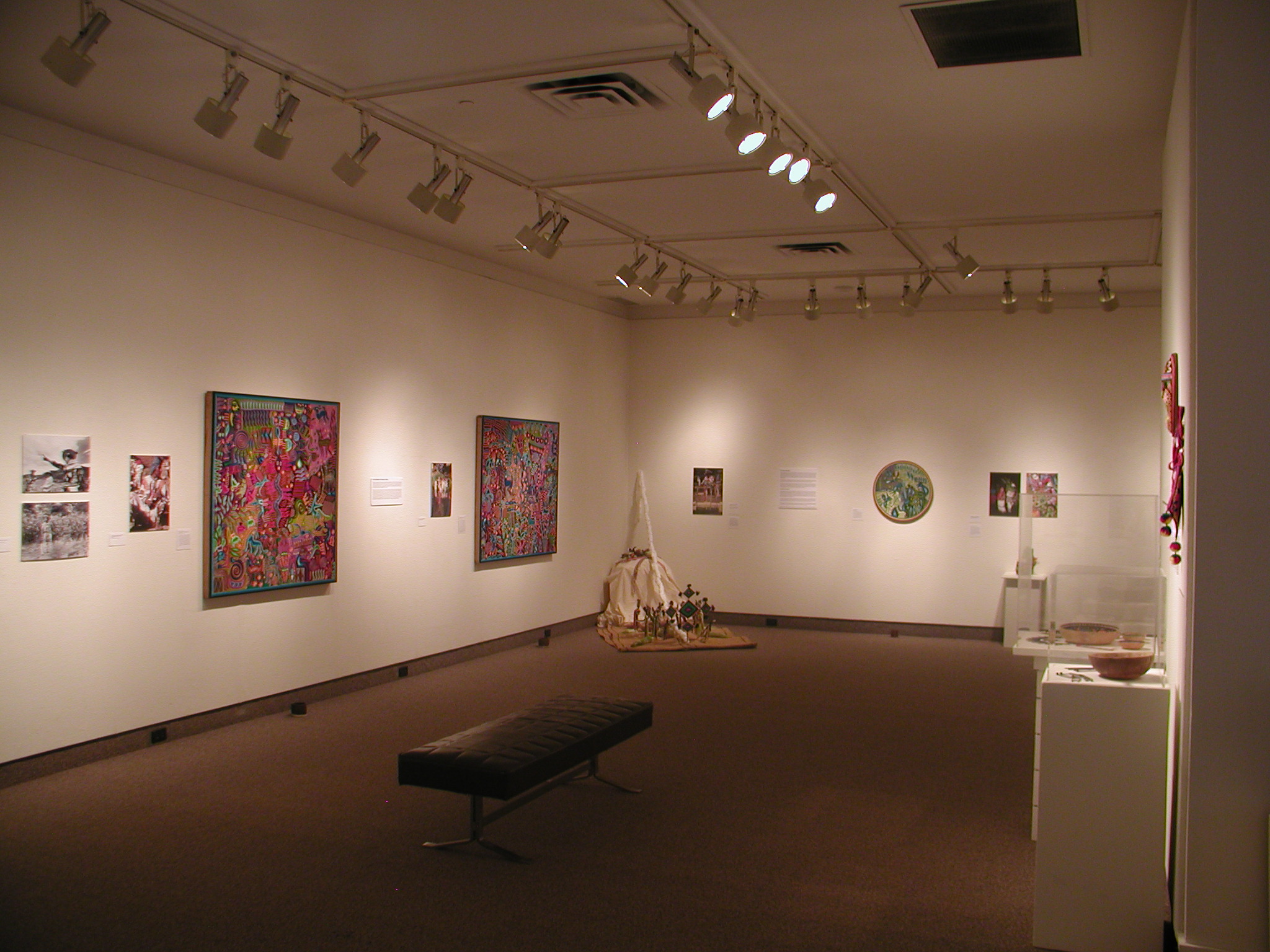 An exhibition of Huichol Art by Jose Benitez Sanchez, featuring yarn paintings, photographs, objects, and garments of the Wixaritari.