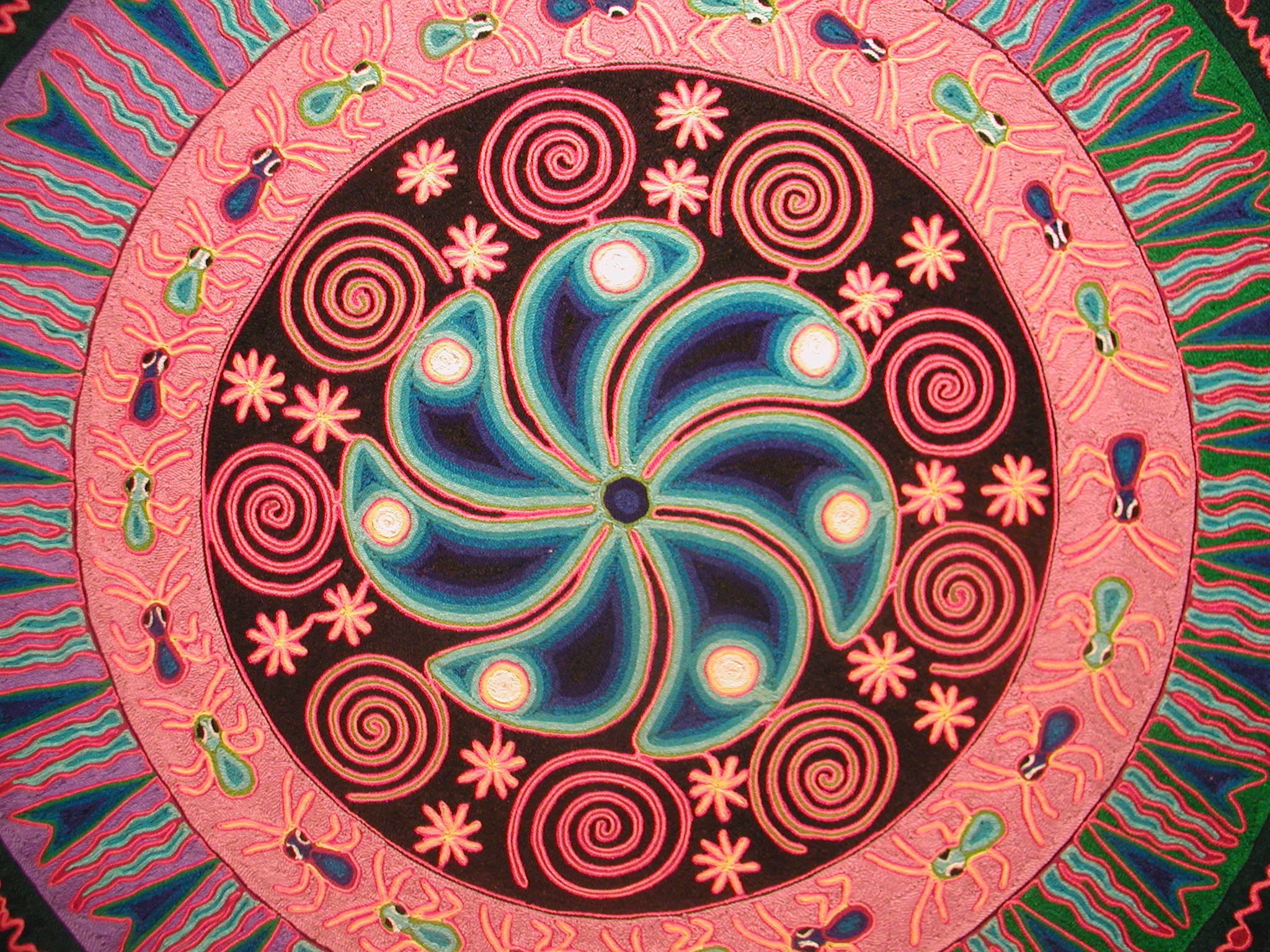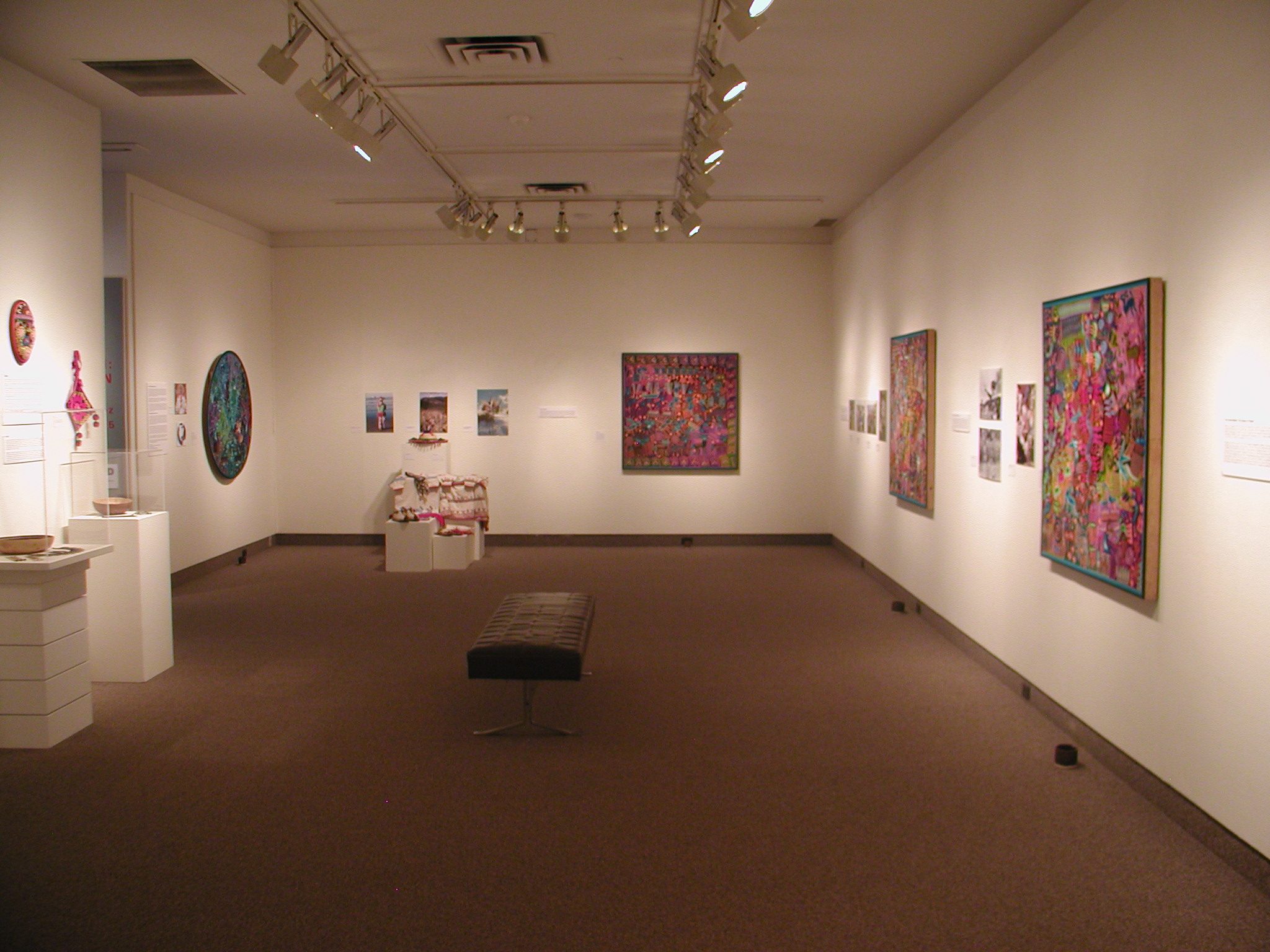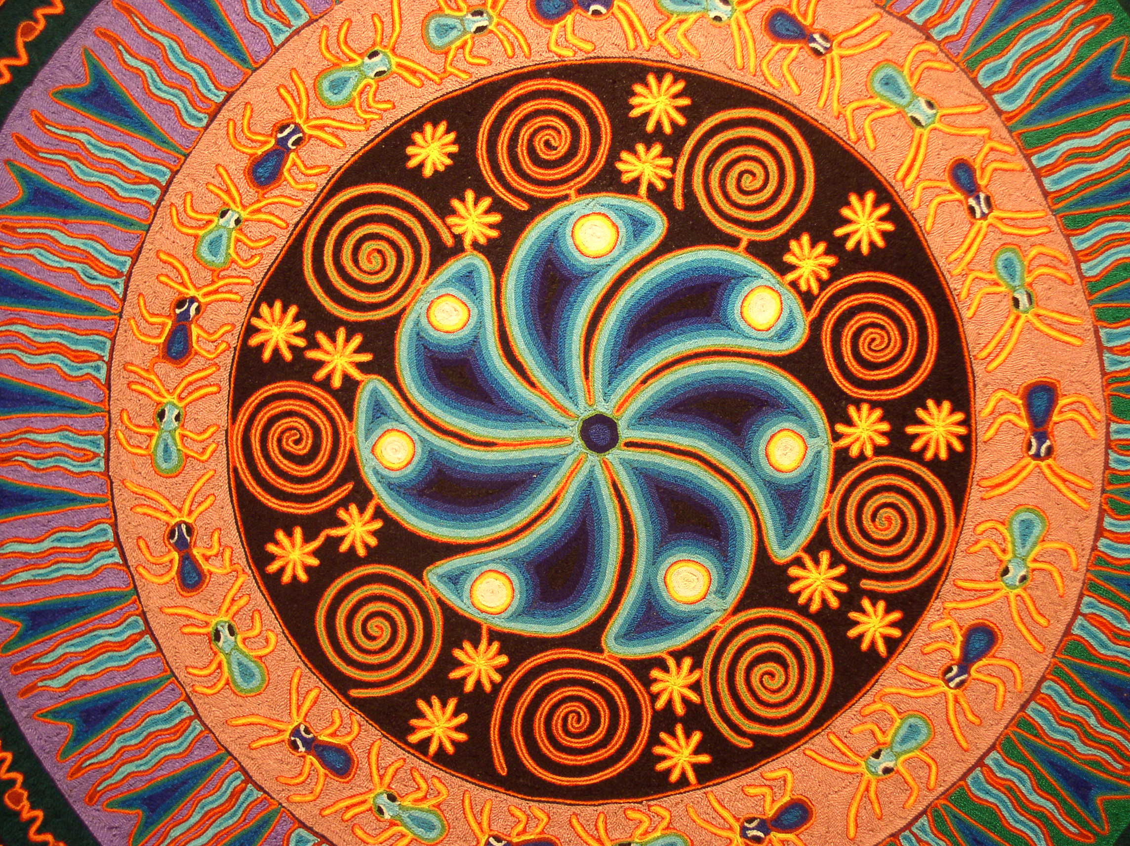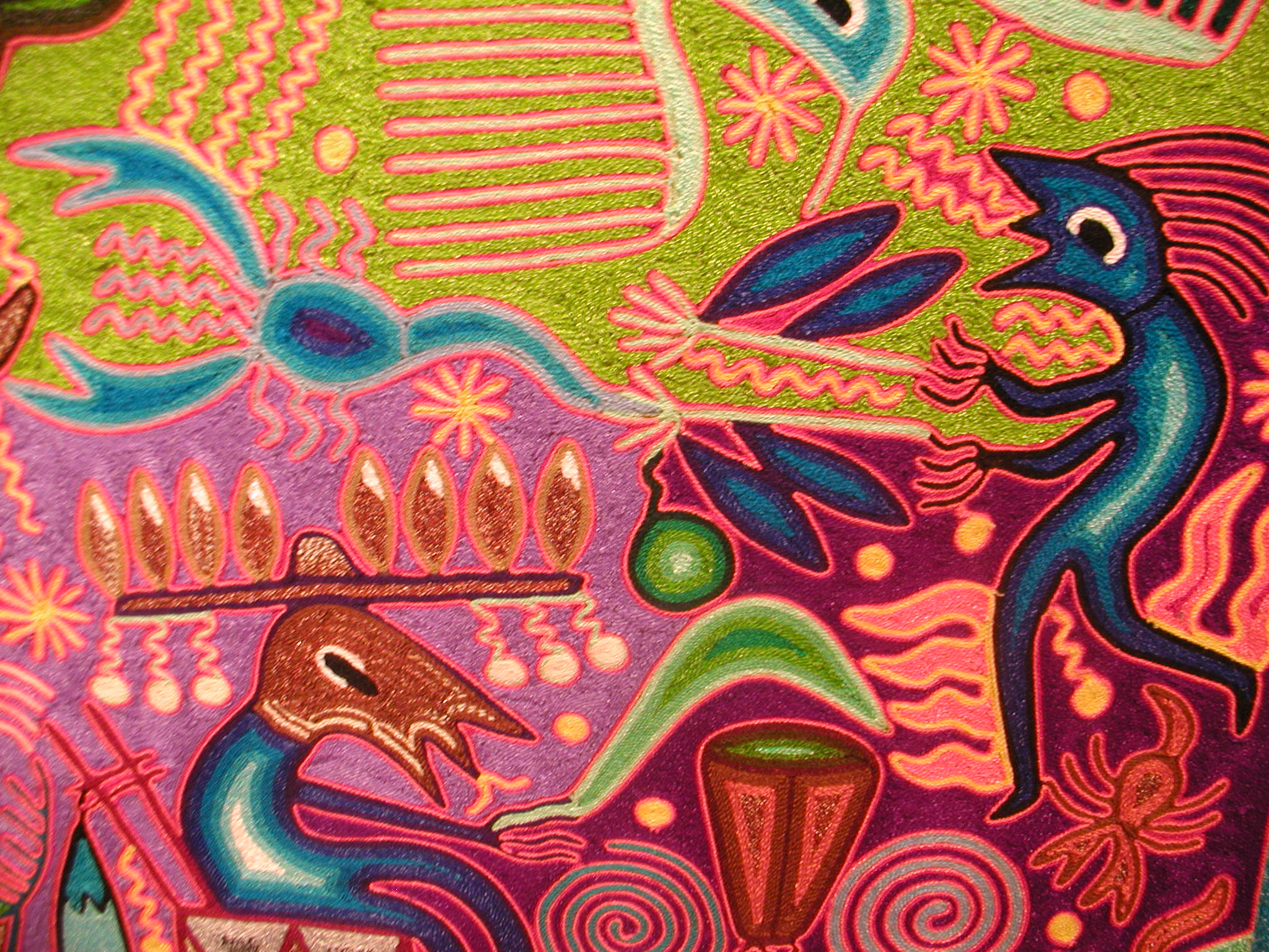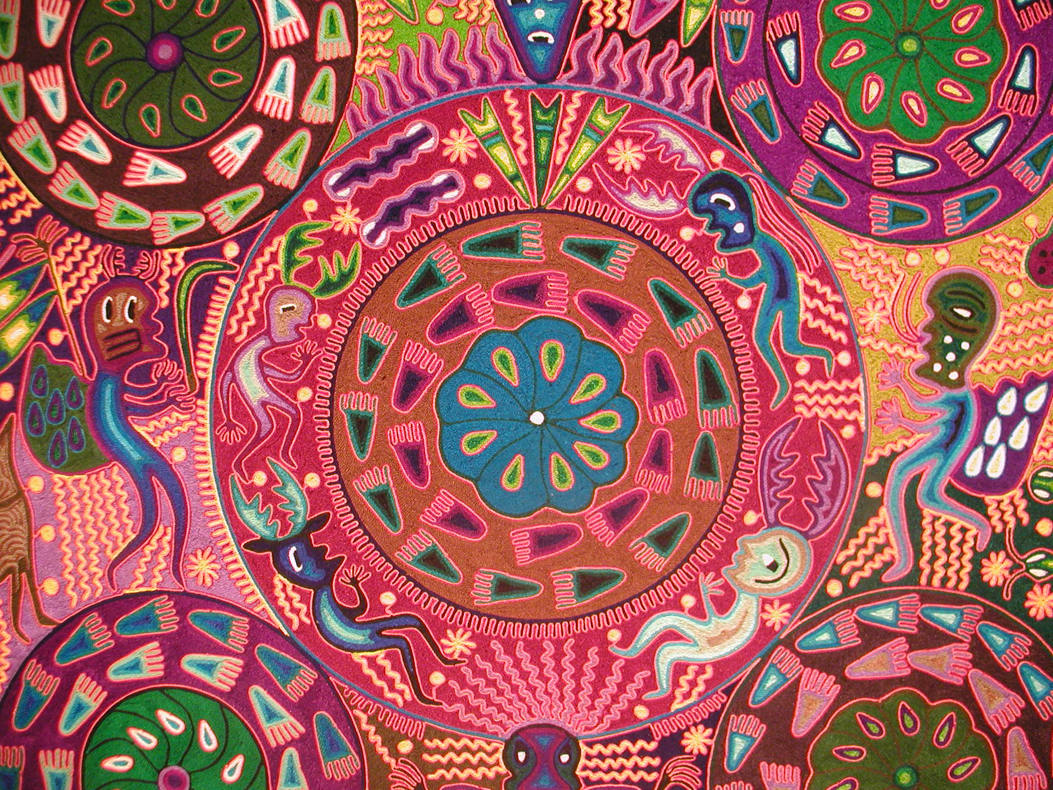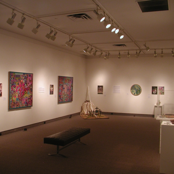 An exhibition of Huichol Art by Jose Benitez Sanchez, featuring yarn paintings, photographs, objects, and garments of the Wixaritari.